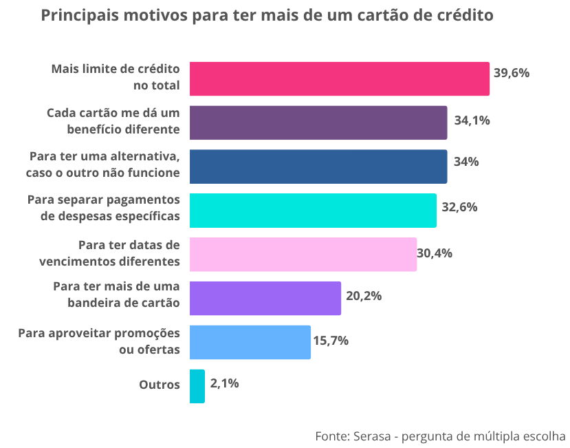 Segundo a pesquisa, a maior parte dos respondentes (44%) afirmam ter entre dois e três cartões de crédito. Além disso, 39,6% utilizam múltiplos cartões para somar limites e ter mais flexibilidade nas compras do dia a dia – por sua vez, 34,1% apontam os diferentes benefícios como motivo para acumular mais de um cartão.