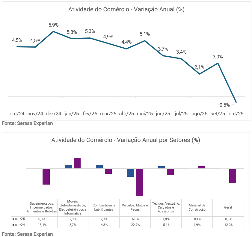 Segundo a economista da datatech, Camila Abdelmalack, o resultado reflete a combinação de fatores macroeconômicos que continuam limitando o consumo. “Mesmo após datas de incentivo ao consumo, como Dia das Crianças, a atividade perdeu força. A inflação ainda pressionada em itens de serviços, a manutenção dos juros elevados e o crédito caro seguem restringindo as compras parceladas e o consumo de bens duráveis, enquanto as famílias permanecem cautelosas diante de um orçamento mais comprometido”, explica.