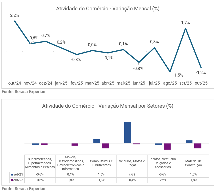 Atividade do comércio cai 1,2% em outubro, mostra Serasa Experian