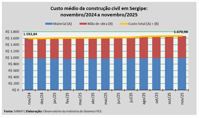 Análise realizada pelo Observatório da Indústria do Sistema FIES, com base nos dados do Sistema Nacional de Pesquisa de Custos e Índices da Construção Civil – SINAPI, uma produção conjunta do IBGE e da Caixa Econômica Federal, revelou que o custo médio da construção em Sergipe, por metro quadrado (m²), em novembro deste ano, aumentou 0,15%, quando comparado com o mês imediatamente anterior, outubro último. Na comparação com o mês de novembro do ano passado, o custo registrado apresentou crescimento de 4,9%. No acumulado do ano, o custo registrado apresentou aumento de 4,8%.