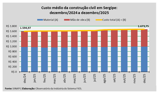 Análise realizada pelo Observatório da Indústria do Sistema FIES, com base nos dados do Sistema Nacional de Pesquisa de Custos e Índices da Construção Civil – SINAPI, uma produção conjunta do IBGE e da Caixa Econômica Federal, revelou que o custo médio da construção em Sergipe, por metro quadrado (m²), em dezembro de 2025, aumentou 0,2%, quando comparado com o mês imediatamente anterior, novembro último. No acumulado do ano, o custo registrado apresentou aumento de 4,9%.