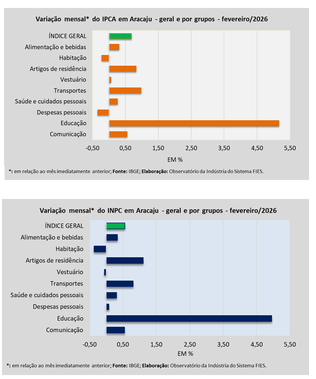 Análise realizada pelo Observatório da Indústria do Sistema FIES, com base nos dados do Instituto Brasileiro de Geografia e Estatística (IBGE), revelou que, em fevereiro deste ano, a capital sergipana teve inflação de 0,68%, medida pelo Índice de Preços ao Consumidor Amplo – IPCA. Com o resultado de fevereiro, a inflação acumulada no ano de 2026 chegou a 1,09%.