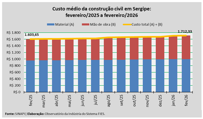Análise realizada pelo Observatório da Indústria do Sistema FIES, com base nos dados do Sistema Nacional de Pesquisa de Custos e Índices da Construção Civil – SINAPI, uma produção conjunta do IBGE e da Caixa Econômica Federal, revelou que o custo médio da construção em Sergipe, por metro quadrado (m²), em fevereiro deste ano, registrou aumento de 0,3%, quando comparado com o mês imediatamente anterior, janeiro último. Na comparação com o mês de fevereiro do ano passado, o custo registrado apresentou crescimento de 6,8%. No acumulado do ano, o custo registrado apresentou aumento de 2,3%.