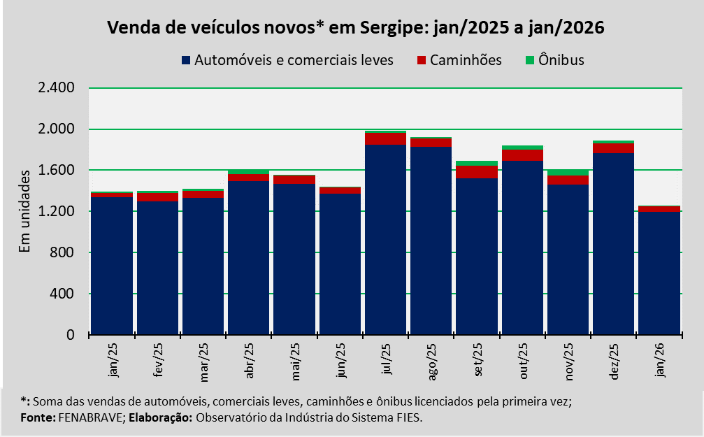 Análise realizada pelo Observatório da Indústria do Sistema FIES, com base nos dados da Federação Nacional da Distribuição de Veículos Automotores (FENABRAVE), apontou que as vendas de veículos novos no estado, no mês de janeiro, totalizaram 1.254 unidades.