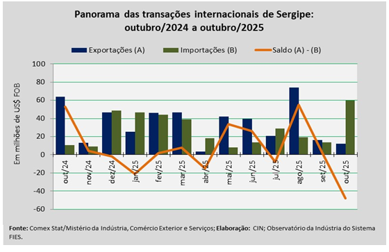 Análise realizada pelo Centro Internacional de Negócios – CIN/SE, da Federação das Indústrias do Estado de Sergipe (FIES), com base nos dados do Comex Stat, sistema para consultas e extração de dados do comércio exterior brasileiro, disponibilizado pelo Mistério da Indústria, Comércio Exterior e Serviços, apontou que as exportações sergipanas, em outubro de 2025, somaram US$ 11,9 milhões. O montante registrado representa uma redução de 81,3%, quando comparado com outubro de 2024. Já na comparação com o mês anterior, setembro último, verificou-se decréscimo de 26,5% nas exportações do estado.