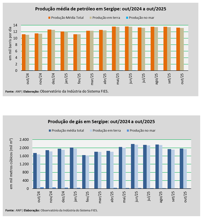 Análise realizada pelo Observatório da Indústria do Sistema FIES, com base nos dados da Agência Nacional do Petróleo, Gás Natural e Biocombustíveis (ANP), revelou que a produção de petróleo no estado, no mês de outubro, alcançou a média de 13,2 mil barris por dia (bpd), registrando um decréscimo de 2,1% em relação à produção média do mês anterior (setembro/2025). No comparativo com outubro de 2024, verificou-se acréscimo de 18,1%.