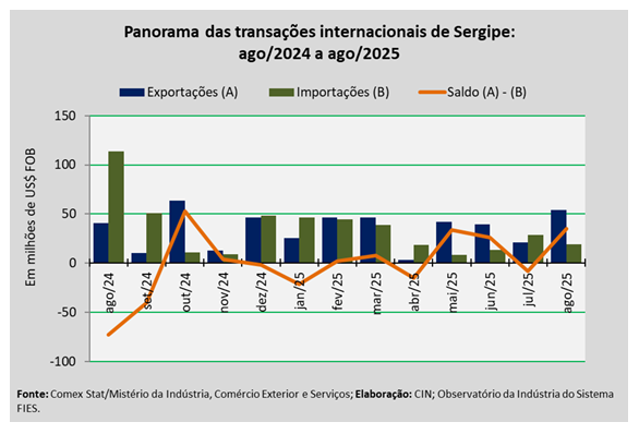 Análise realizada pelo Centro Internacional de Negócios – CIN/SE, da Federação das Indústrias do Estado de Sergipe (FIES), com base nos dados do Comex Stat, sistema para consultas e extração de dados do comércio exterior brasileiro, disponibilizado pelo Mistério da Indústria, Comércio Exterior e Serviços, apontou que as exportações sergipanas, em agosto de 2025, somaram US$ 54,1 milhões. O montante registrado representa aumento de 32,1%, quando comparado com agosto de 2024. Já na comparação com o mês anterior, julho último, verificou-se acréscimo de 157,9% nas exportações do estado.