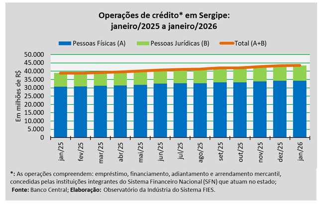 Análise realizada pelo Observatório da Indústria do Sistema FIES, com base nos dados do Banco Central, revelou que o saldo total das operações de crédito em Sergipe totalizou aproximadamente R$ 43,5 bilhões, no mês de janeiro de 2026.