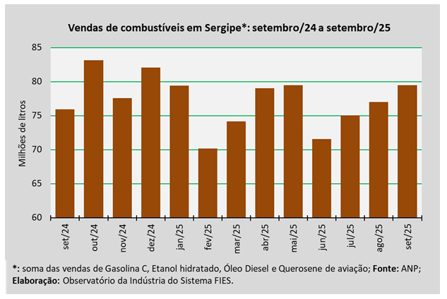 Análise realizada pelo Observatório da Indústria do Sistema FIES, com base nos dados da Agência Nacional do Petróleo, Gás Natural e Biocombustíveis (ANP), indicou que as vendas totais de combustíveis em Sergipe, em setembro de 2025, somaram aproximadamente 79,5 milhões de litros, assinalando um acréscimo de 4,7% quando comparado a setembro de 2024. Em relação ao mês imediatamente anterior (agosto/2025), as vendas aumentaram 3,2%.