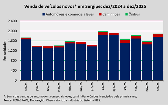 Análise realizada pelo Observatório da Indústria do Sistema FIES, com base nos dados da Federação Nacional da Distribuição de Veículos Automotores (FENABRAVE), apontou que as vendas de veículos novos no estado, no mês de dezembro, totalizaram 1.887 unidades.