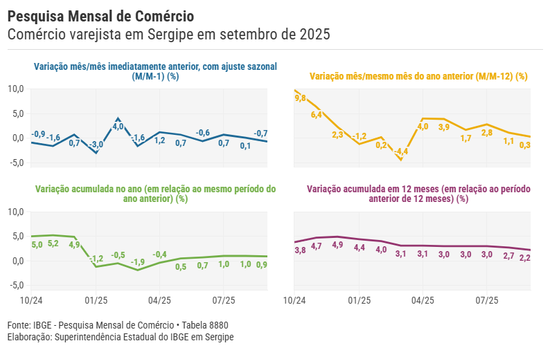 O volume de vendas no comércio varejista de Sergipe teve retração de 0,7% em setembro de 2025, quando comparado ao volume de vendas do mês de agosto deste ano, na série com ajuste sazonal. Na comparação entre os meses de setembro de 2025 e setembro de 2024, houve crescimento de 0,3%. Na variação acumulada no ano, a alta foi de 0,9% e, no acumulado nos últimos 12 meses, o crescimento chegou a 2,2%. Os dados são da Pesquisa Mensal de Comércio (PMC) divulgada nesta quinta-feira (13) pelo IBGE.